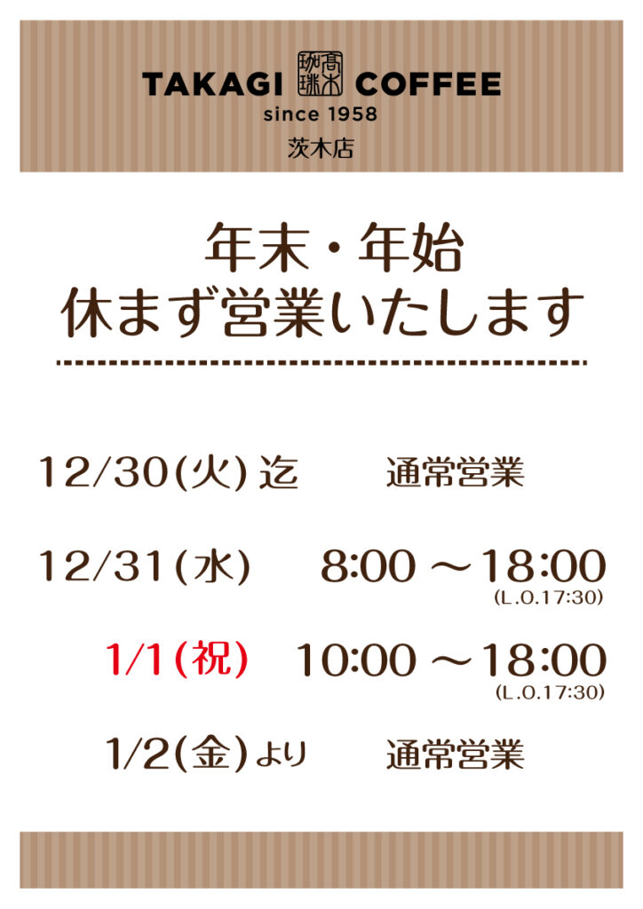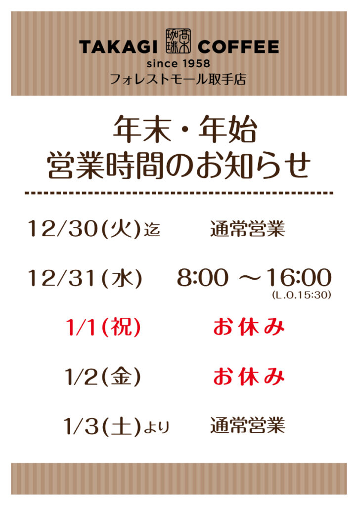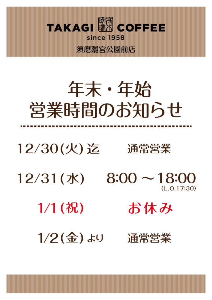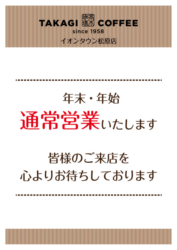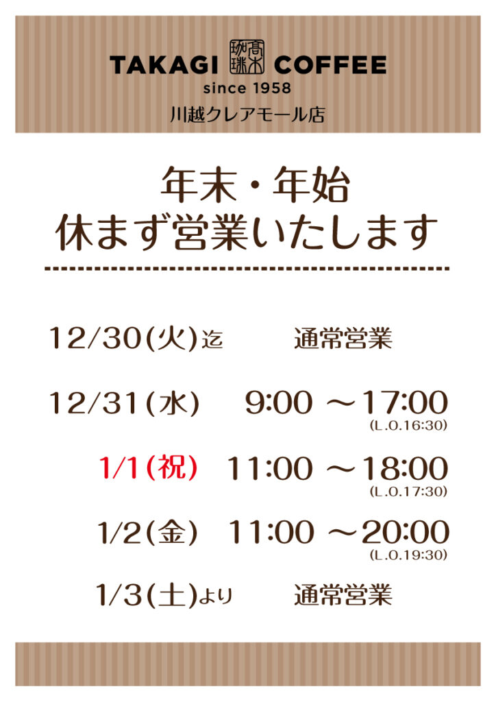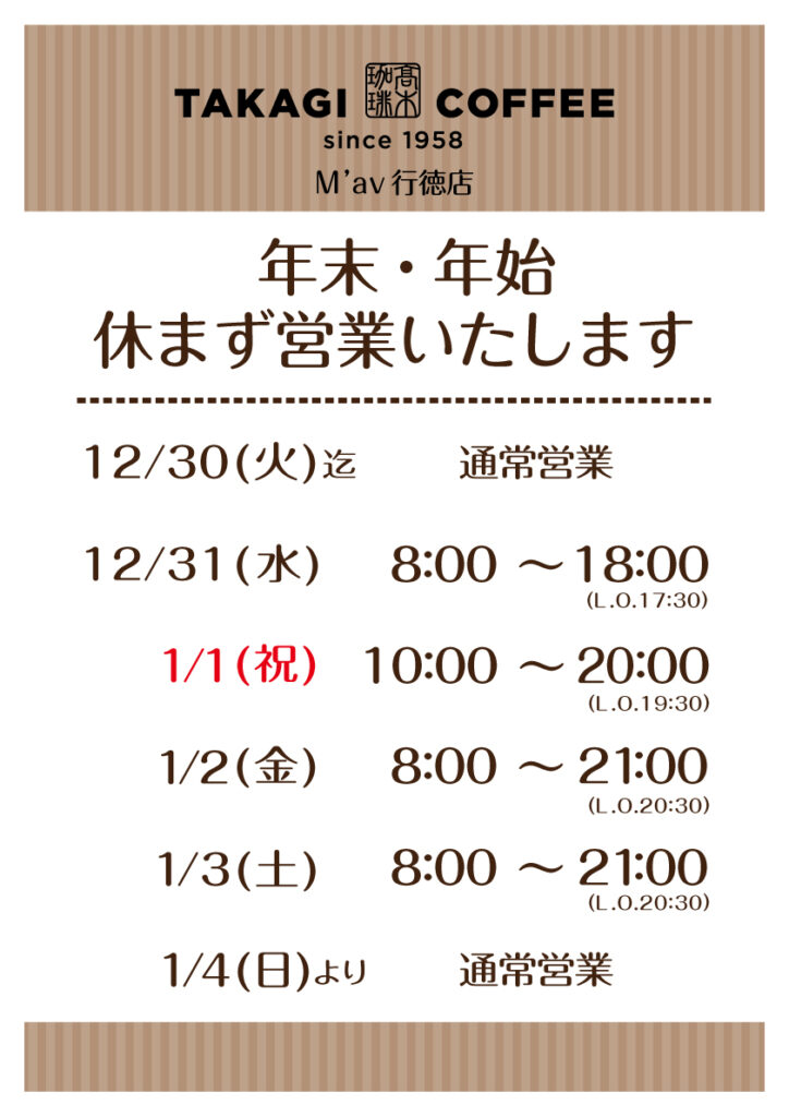カテゴリー 年末年始 臨時のお知らせ 年末年始(2025〜2026)営業時間のご案内 投稿者 作成者: 管理人 投稿日 2025年12月22日 いつも髙木珈琲をご利用いただき誠にありがとうございます。店舗ごとに営業時間が異なりますので、画像にて各店舗の営業時間をご確認ください。年末年始も皆さまのご来店をお待ちしております。 タグ 新年, 2026, お正月, 営業時間, 年末年始 ← 【期間限定】この冬だけの特別なホワイトチョコレート、シーズナブルメニューが新登場!